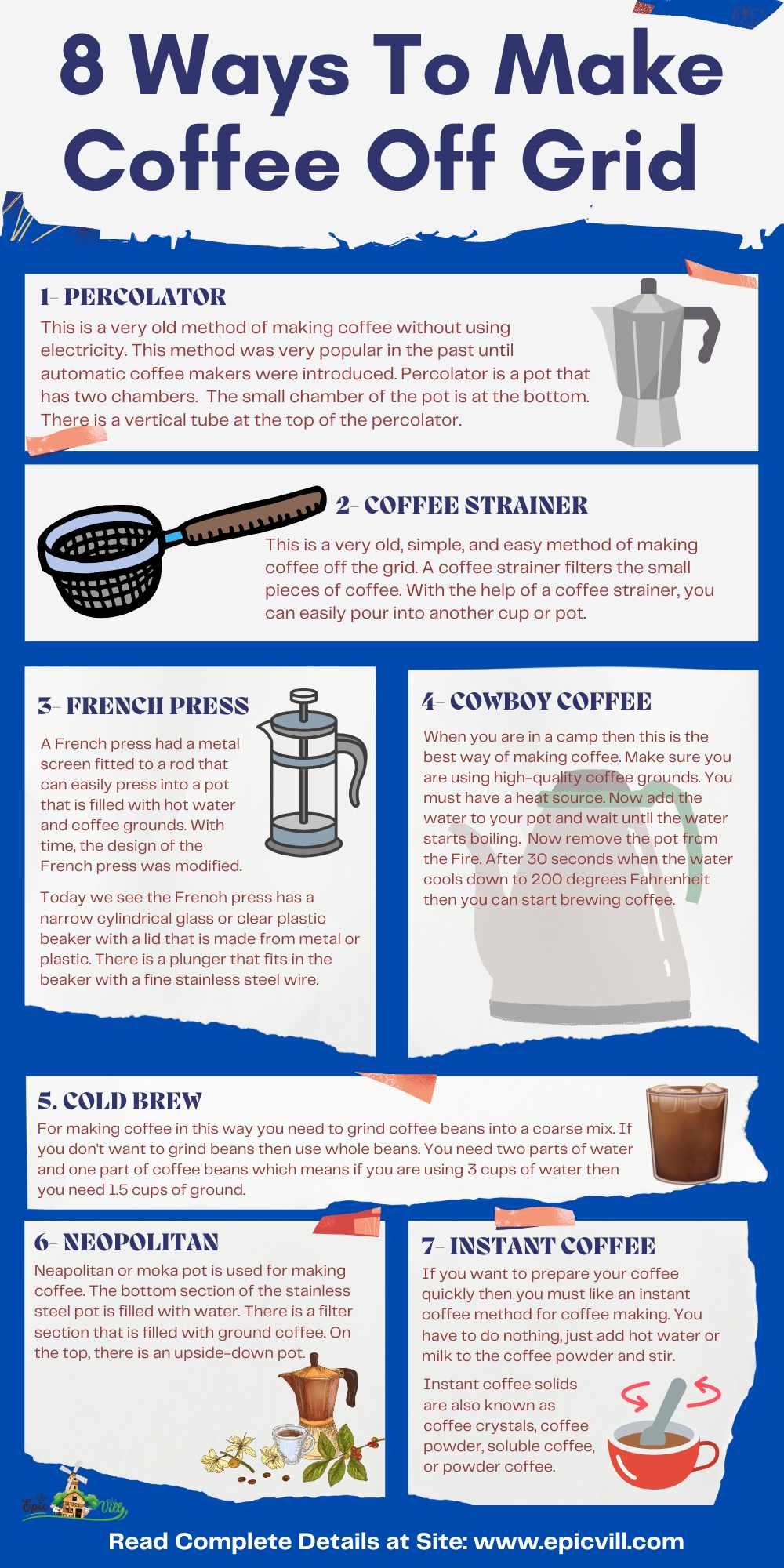 This is a very old, simple, and easy method of making coffee off the grid. A coffee strainer filters the small pieces of coffee. With the help of a coffee strainer, you can easily pour into another cup or pot.